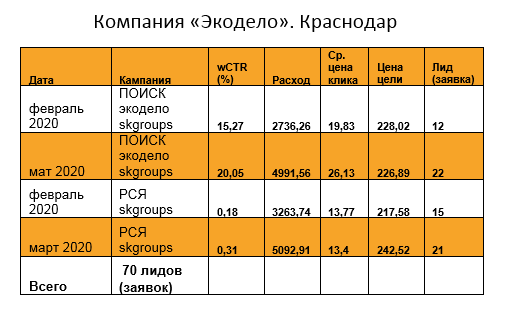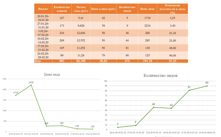 РЕЗУЛЬТАТ: По итогам двух месяцев ведения рекламных кампаний было получено 832 заявки в Яндекс Директе и GOOGLE ADWORDS. Стоимость одной заявки составила 203 рубля.