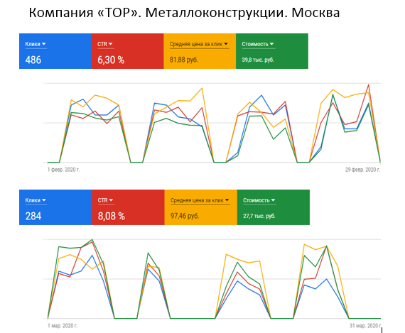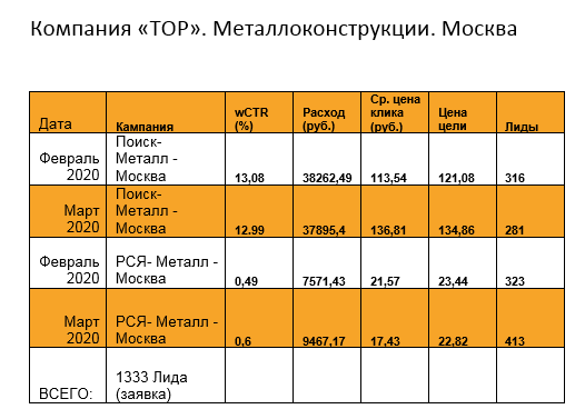 РЕЗУЛЬТАТ: По итогам двух месяцев ведения рекламных кампаний было получено 1333 лида Яндекс Директ и в 766 GOOGLE ADWORDS. По итогу получилось 79 заказов по металлоконструкциям. Стоимость одной заявки составила 2066 рублей.